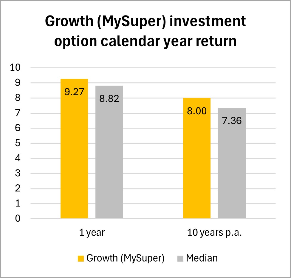 2025 was another strong year for most major asset classes. Our Growth (MySuper) investment option returned a healthy 9.27% for the calendar year, which was ahead of the median super fund return in 2025 and above its 10-year average annual return of 8.00%.1
