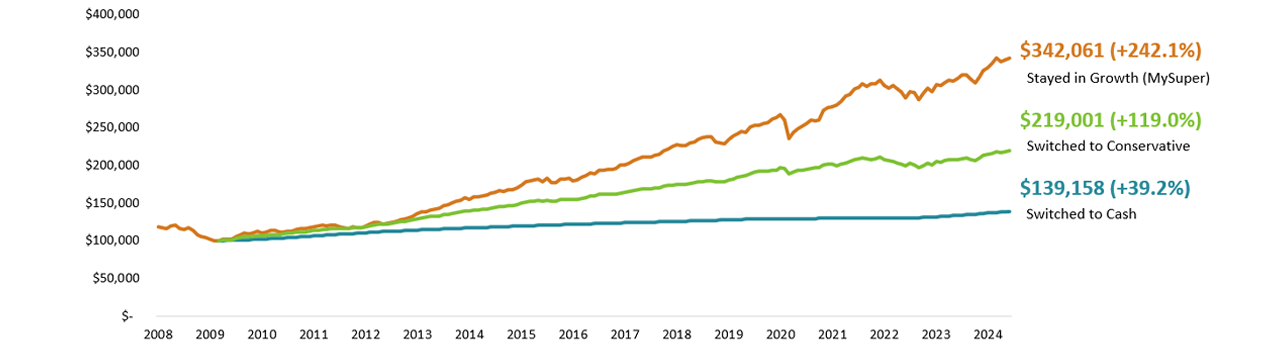 Calculations are based on historical crediting rates from 30 June 2008 to 30 June 2024, switching on 31 March 2009 with a super account balance of $100,000. The Cash return reflects the historical crediting rates of the Cash investment option from 1 April 2009. Prior to this date, the historical performance of the Capital Guaranteed Option has been used for illustration purposes. Past performance is not a reliable indicator of future performance.